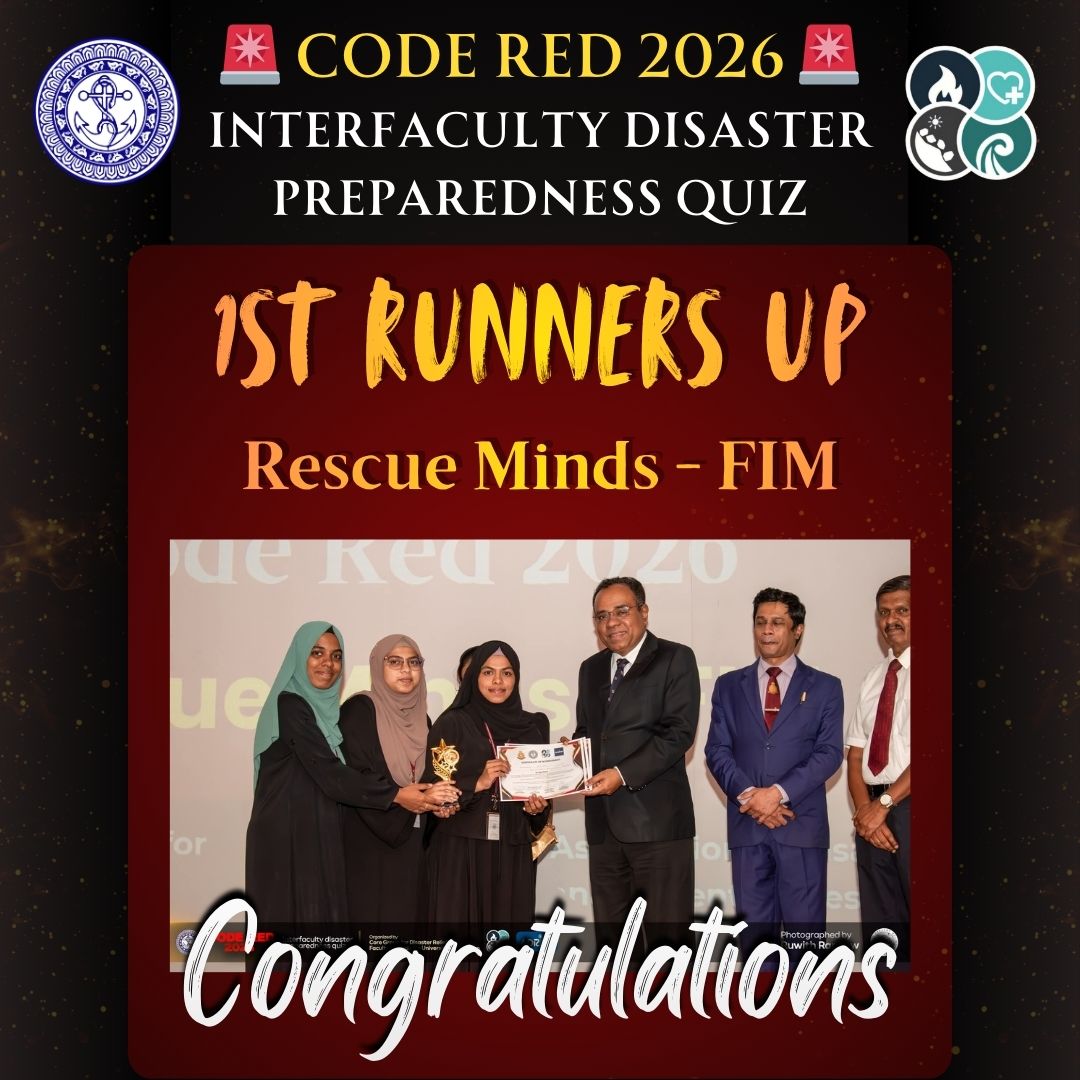 A total of six participants from the Bachelor Unani Medicine and Surgery (BUMS) 2019/2020 batch, representing two teams from the Faculty of Indigenous Medicine, took part in the “Code Red – Inter Faculty Disaster Preparedness Quiz,” organized by the Core Group for Disaster Relief, Faculty of Medicine, University of Colombo, in collaboration with ADRiMP. The competition was held on 7th February 2026 from 1.00 p.m. onward at the UCFM Tower, Faculty of Medicine, University of Colombo. Out of the two teams, the team named “Rescue Minds” achieved the First Runner-Up position, bringing great recognition to the faculty.